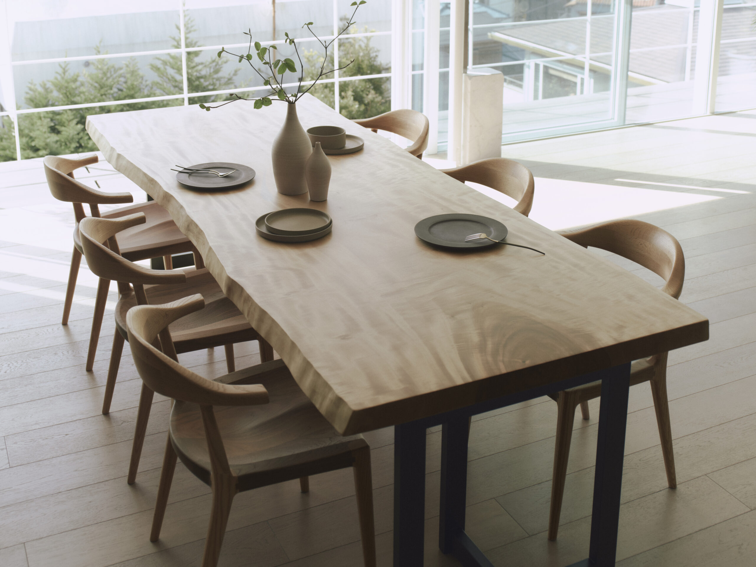 特に脚部の繊細なラインは、無垢材の魅力を最大限に引き出すため、手仕事ならではの柔らかさと温もりが感じられる仕上がりです。