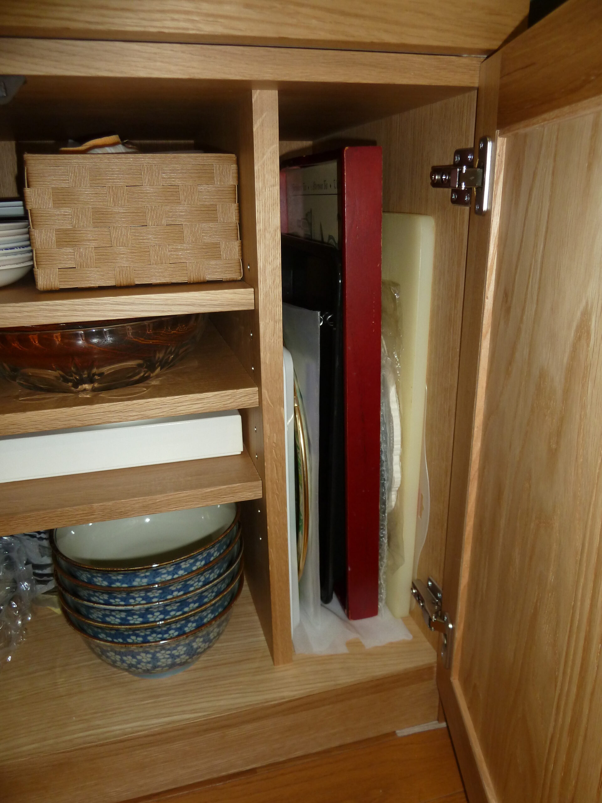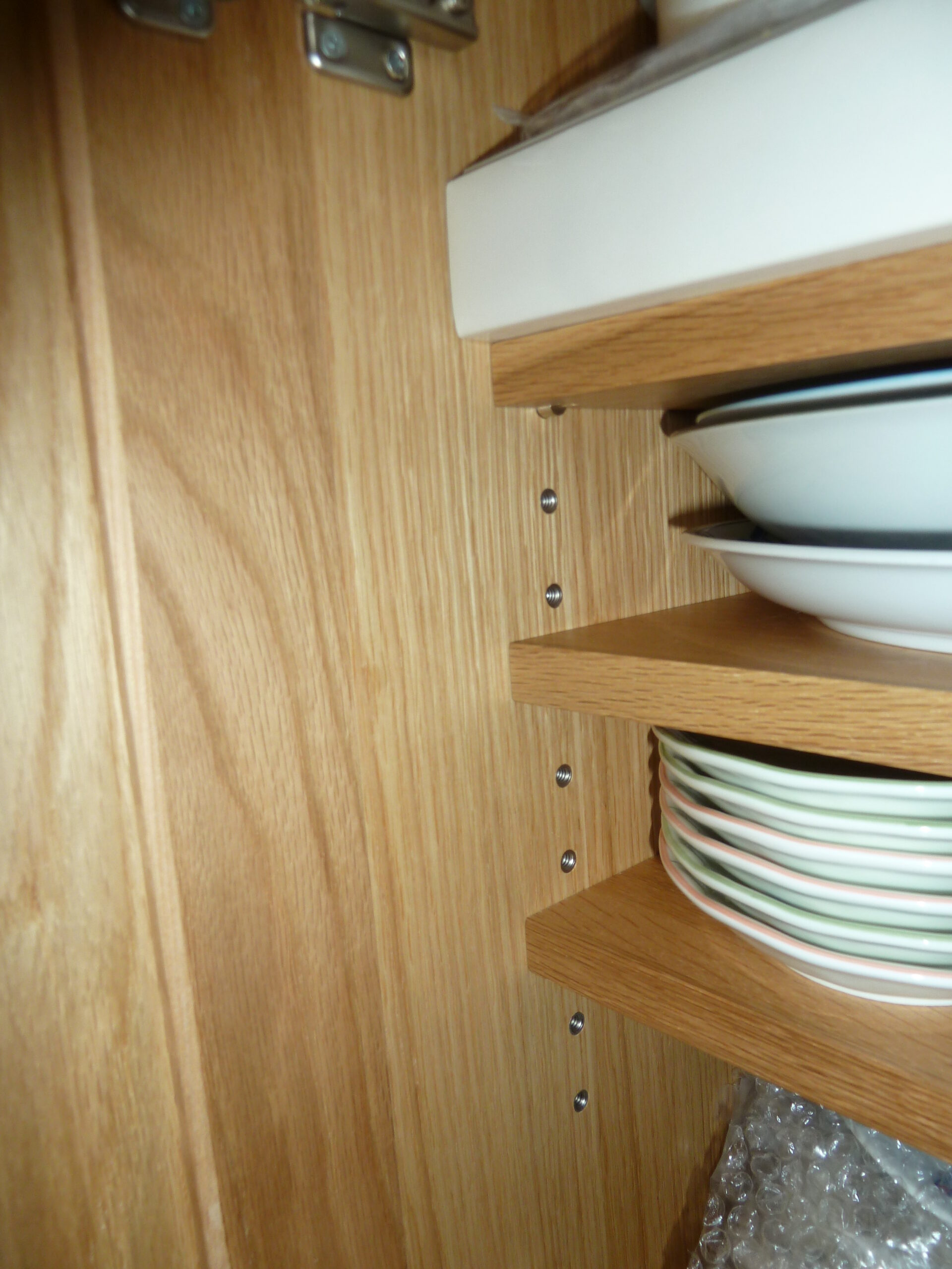 通常の葉山家具の製品では、棚板を固定するダボ穴を60mmピッチとしておりますが、今回は多種多様な大きさの食器を効率よく収納できるよう、30mmピッチへと変更しました。