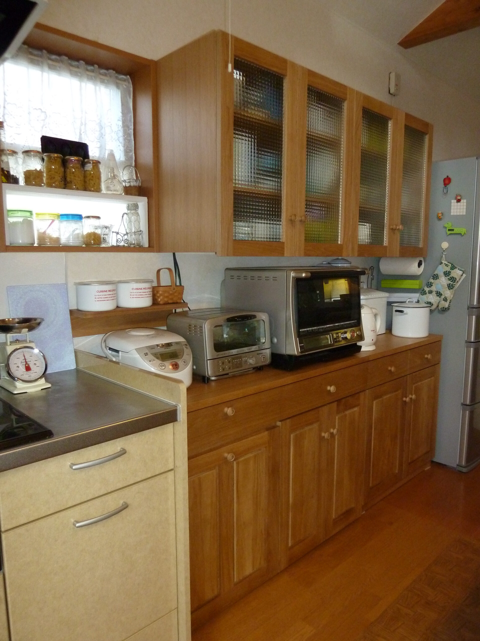 カントリー家具のような温かみのある印象を与えながら、収納した食器を程よく目隠しできる、機能と意匠を兼ね備えた意匠です。